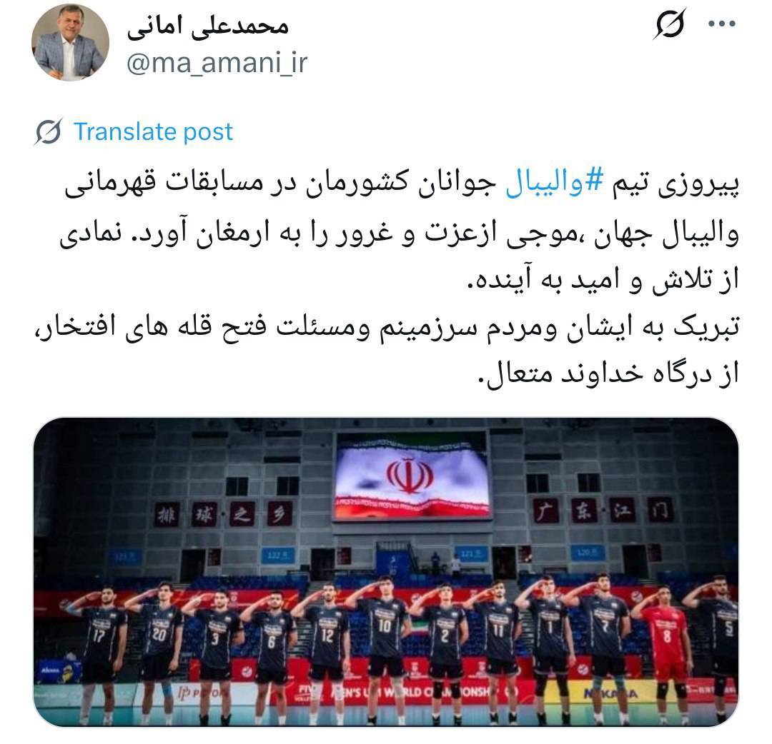 پیروزی تیم والیبال جوانان کشورمان در مسابقات قهرمانی والیبال جهان، موجی از عزت و غرور را به ارمغان آورد. نمادی از تلاش و امید به آینده. تبریک به ایشان و مردم سرزمینم و مسئلت فتح قلههای افتخار، از درگاه خداوند متعال.