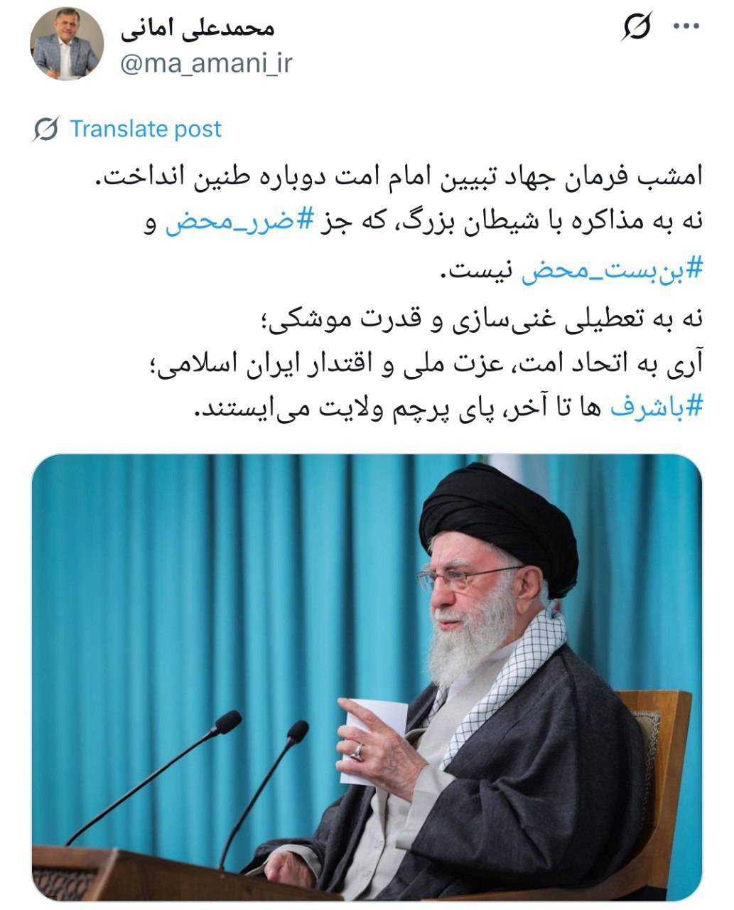 امشب فرمان جهاد تبیین امام امت دوباره طنین انداخت. نه به مذاکره با شیطان بزرگ، که جز #ضرر_محض و #بنبست_محض نیست. نه به تعطیلی غنیسازی و قدرت موشکی؛ آری به اتحاد امت، عزت ملی و اقتدار ایران اسلامی؛ #باشرف ها تا آخر، پای پرچم ولایت میایستند.