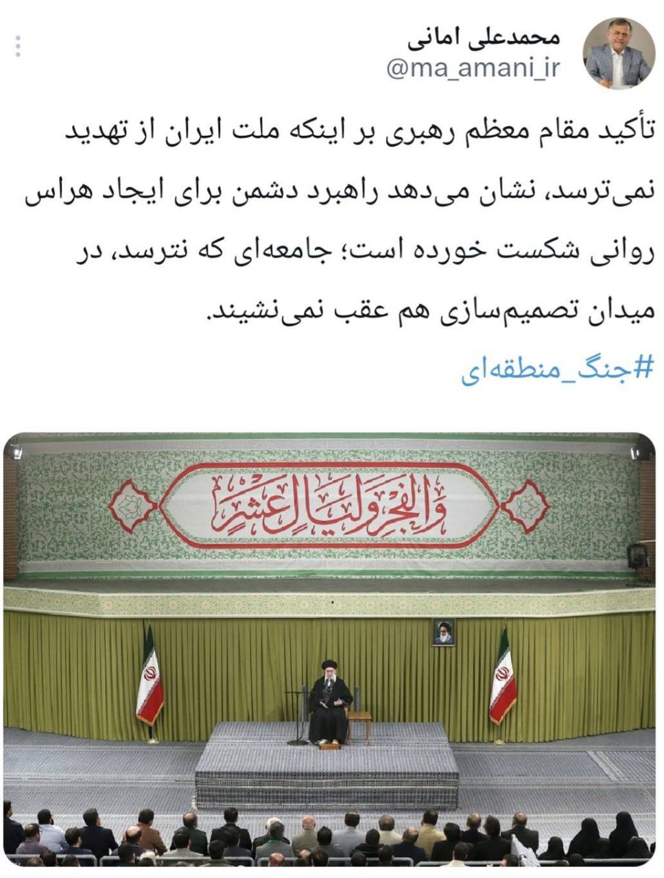 📡تأکید مقام معظم رهبری بر اینکه ملت ایران از تهدید نمی‌ترسد، نشان می‌دهد راهبرد دشمن برای ایجاد هراس روانی شکست خورده است؛ جامعه‌ای که نترسد، در میدان تصمیم‌سازی هم عقب نمی‌نشیند.