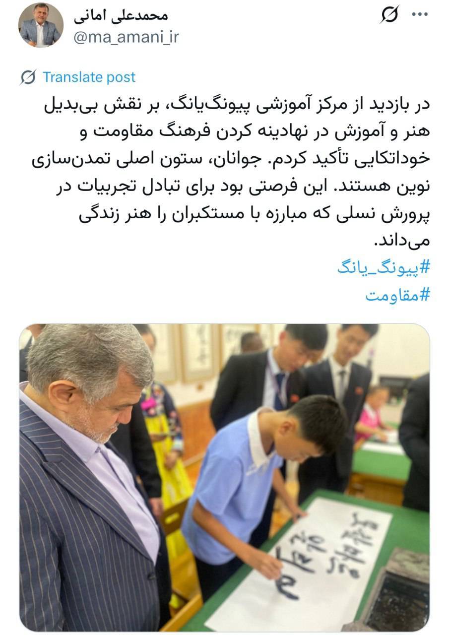 در بازدید از مرکز آموزشی پیونگیانگ، بر نقش بیبدیل هنر و آموزش در نهادینه کردن فرهنگ مقاومت و خوداتکایی تأکید کردم. جوانان، ستون اصلی تمدنسازی نوین هستند. این فرصتی بود برای تبادل تجربیات در پرورش نسلی که مبارزه با مستکبران را هنر زندگی میداند.