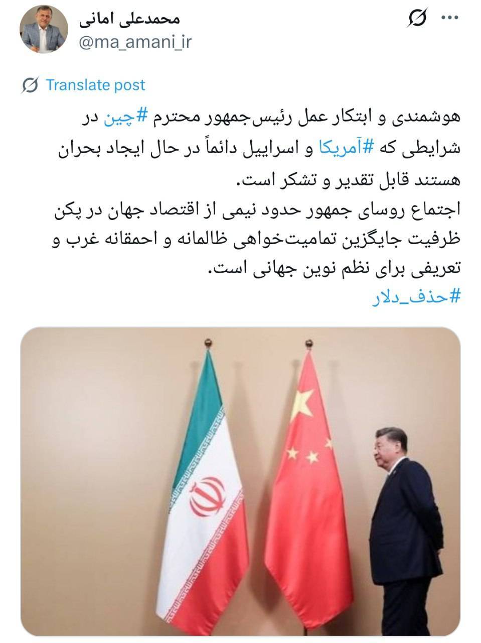 هوشمندی و ابتکار عمل رئیس جمهور محترم چین در شرایطی که آمریکا و اسراییل دائماً در حال ایجاد بحران هستند قابل تقدیر و تشکر است.