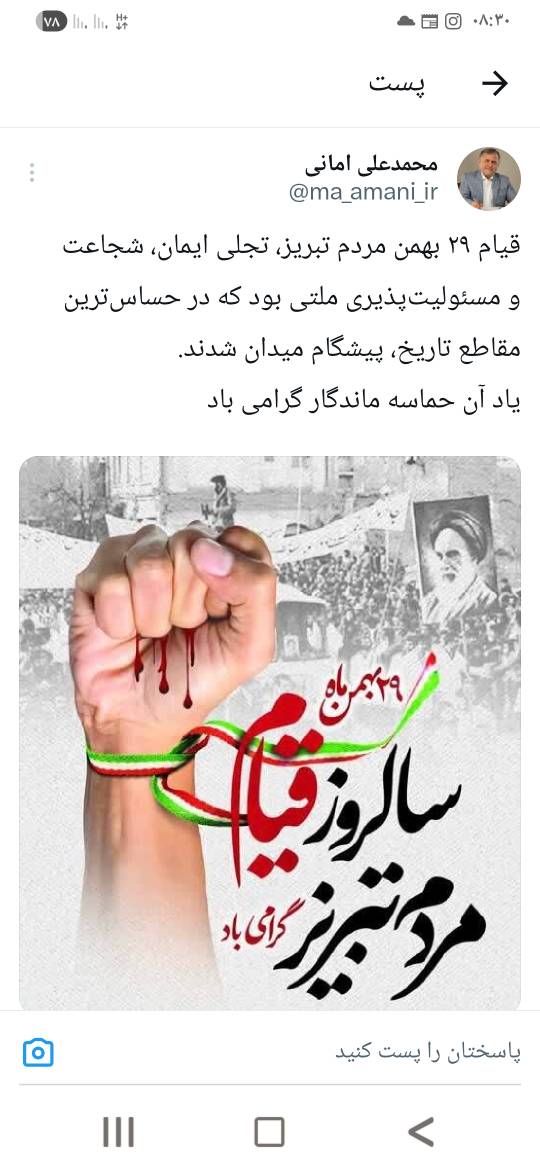 به گزلرش کانال خبری شما؛ محمدعلی امانی در صفحه شخصی خود قیام ۲۹ بهمن مردم تبریز را حماسهای ماندگار دانست و آن را تجلیگر ایمان و شجاعت و مسئولیتپذیری در مقطع تاریخ ساز کشور قلمداد کرد.
