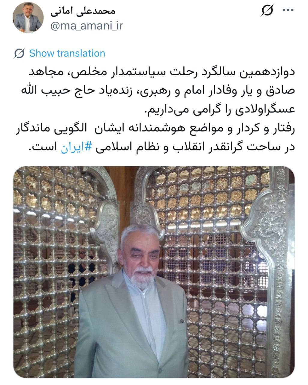 دوازدهمین سالگرد رحلت سیاستمدار مخلص، مجاهد صادق و یار وفادار امام و رهبری، زندهیاد حاج حبیب الله عسگراولادی را گرامی میداریم.