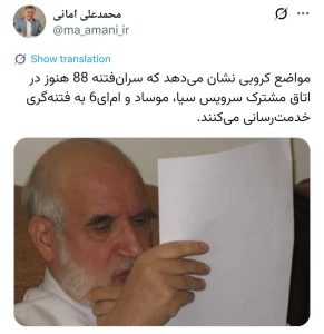 محمدعلی امانی: مواضع کروبی نشان می‌دهد که سران فتنه ۸۸ هنوز در اتاق مشترک سرویس سیا، موساد و MI6 به فتنه‌گری خدمت رسانی می‌کنند