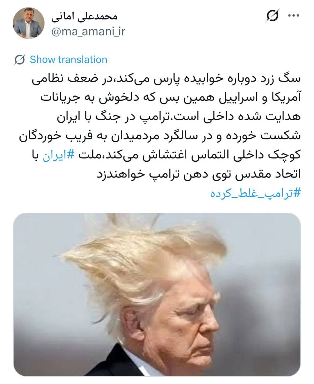 سگ زرد دوباره خوابیده پارس میکند، در ضعف نظامی آمریکا و اسراییل همین بس که دلخوش به جریانات هدایت شده داخلی است. ترامپ در جنگ با ایران شکست خورده و در سالگرد مرد میدان به فریب خوردگان کوچک داخلی التماس اغتشاش میکند، ملت #ایران با اتحاد مقدس توی دهن ترامپ خواهند زد.