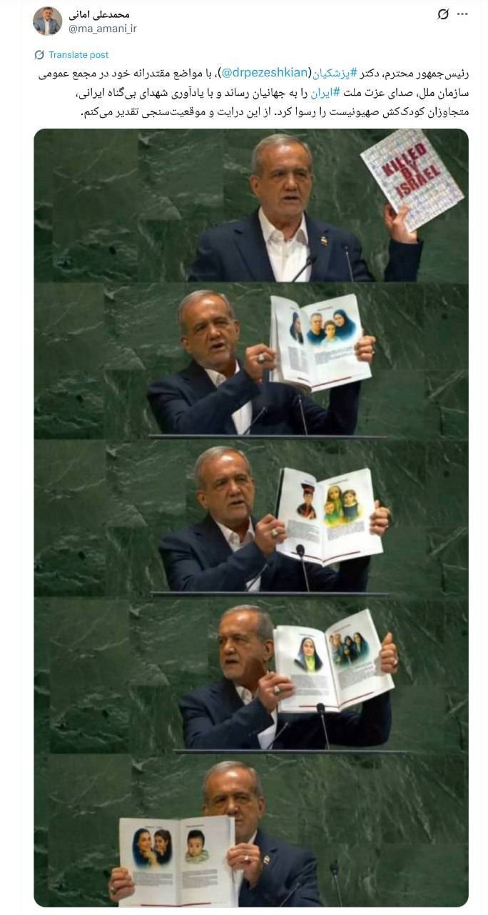 رئیسجمهور محترم، دکتر #پزشکیان(@drpezeshkian)، با مواضع مقتدرانه خود در مجمع عمومی سازمان ملل، صدای عزت ملت #ایران را به جهانیان رساند و با یادآوری شهدای بیگناه ایرانی، متجاوزان کودککش صهیونیست را رسوا کرد. از این درایت و موقعیتسنجی تقدیر میکنم.