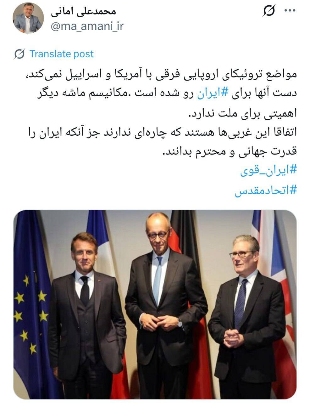 مواضع تروئیکای اروپایی فرقی با آمریکا و اسراییل نمیکند، دست آنها برای ایران رو شده است. مکانیسم ماشه دیگر اهمیتی برای ملت ندارد. اتفاقا این غربیها هستند که چارهای ندارند جز آنکه ایران را قدرت جهانی و محترم بدانند.
