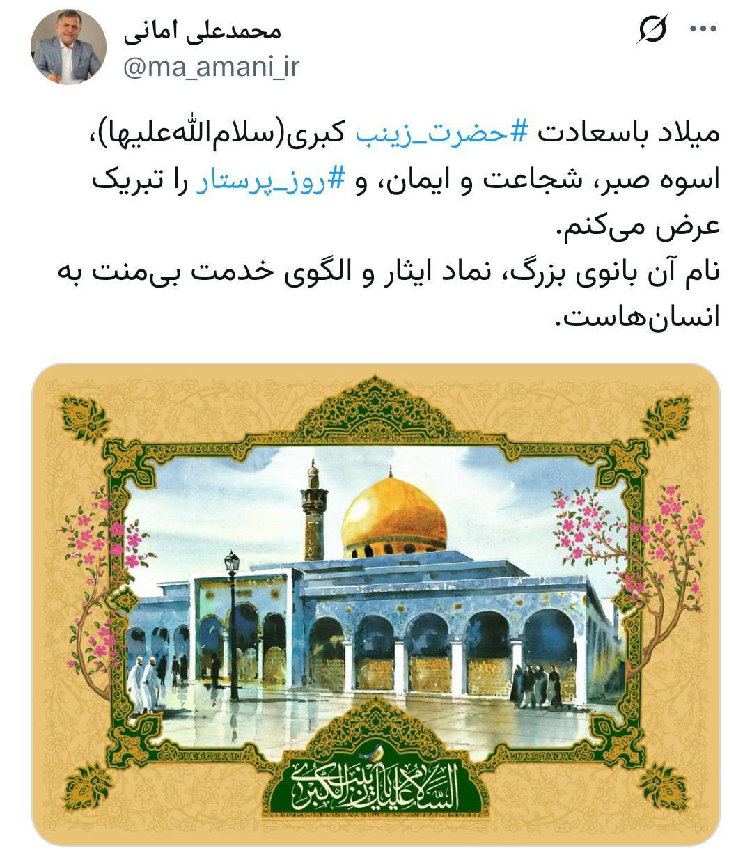میلاد باسعادت #حضرت_زینب کبری(سلام الله علیها)، اسوه صبر، شجاعت و ایمان، و روز پرستار را تبریک عرض میکنم. نام آن بانوی بزرگ، نماد ایثار و الگوی خدمت بیمنت به انسانهاست.