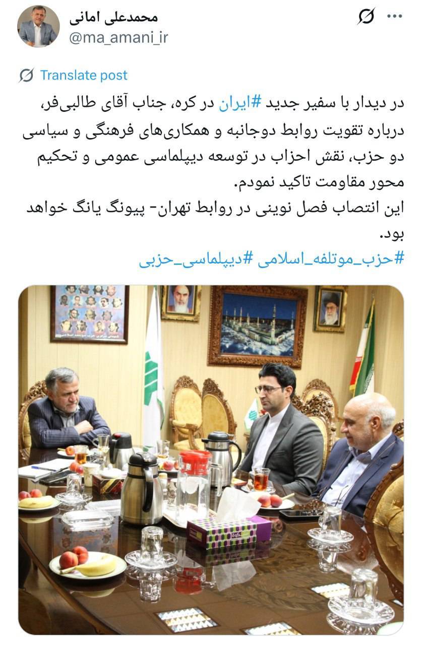در دیدار با سفیر جدید ایران در کره، جناب آقای طالبیفر، درباره تقویت روابط دوجانبه و همکاریهای فرهنگی و سیاسی دو حزب، نقش احزاب در توسعه دیپلماسی عمومی و تحکیم محور مقاومت تاکید نمودم.